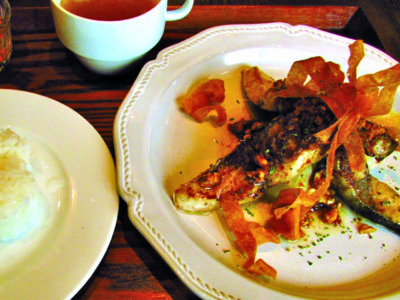 オーナーの妻でシェフの純子さん(41)がつくるカンパチの焦がしバターソース(1300円)が素晴らしい。クルミやハーブなどをアクセントに、隠し味を随所に施した焦がしバターソースの風味はほかでは味わえない絶品のフランス風料理だ。