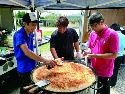 訪ねたのは市内船形地区や西岬地区など、いずれも停電が続いている地域。畑地区などは未だ断水状態だった。各地区の公共施設などを拠点に大きなパエリア鍋で米を炊き、おにぎりと味噌汁を振る舞った。停電で炊飯器が使えず温かいごはんを久しぶりに食べたという人も多く、予想以上に喜んでもらえたという。