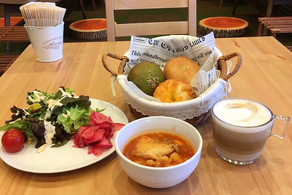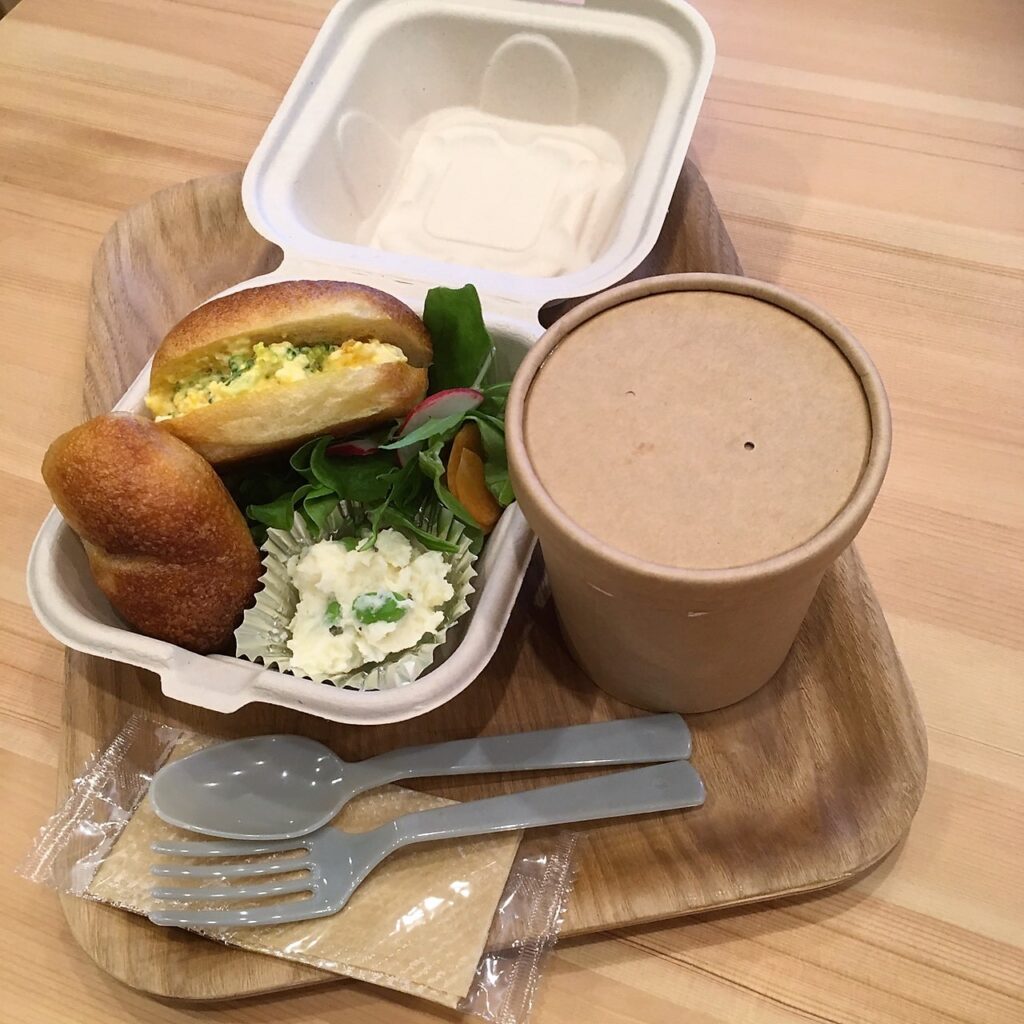 テイクアウトのランチボックス(ベーグル2個または卵サンド、ミニサラダ、スープ付き)=800円、ベーグルとスープかサラダのセット(500円)も人気。ベーグル、スープ、サラダ、ドリンクバーのビュッフェは大人1300円、小学生800円、幼児500円。ビュッフェ以外のイートインメニューもある。