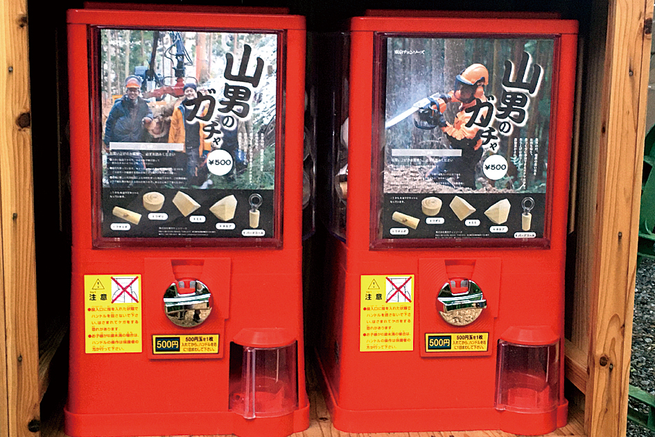 東京チェンソーズ(檜原村、青木亮輔代表)がスギを主とした檜原の木で新たなお土産を開発した。木のさまざまな部位を生かしたマグネットやバードコールなどの小さな木製品をガチャガチャで販売するもので、その名も「山男のガチャ」。このほど払沢の滝遊歩道に本体を設置した。