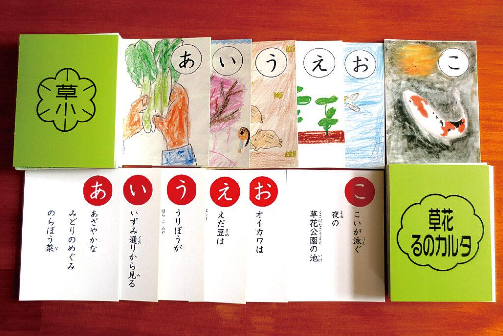 50セットを作成。コロナ禍で当面、「カルタ大会」は実施できないが、各学年で地域を学ぶ授業の際に活用していくという。田中校長は「学校、地域、保護者が得意なところを出し合い、草花のいいところがいっぱい詰まったカルタができた」と出来栄えに納得の様子だった。