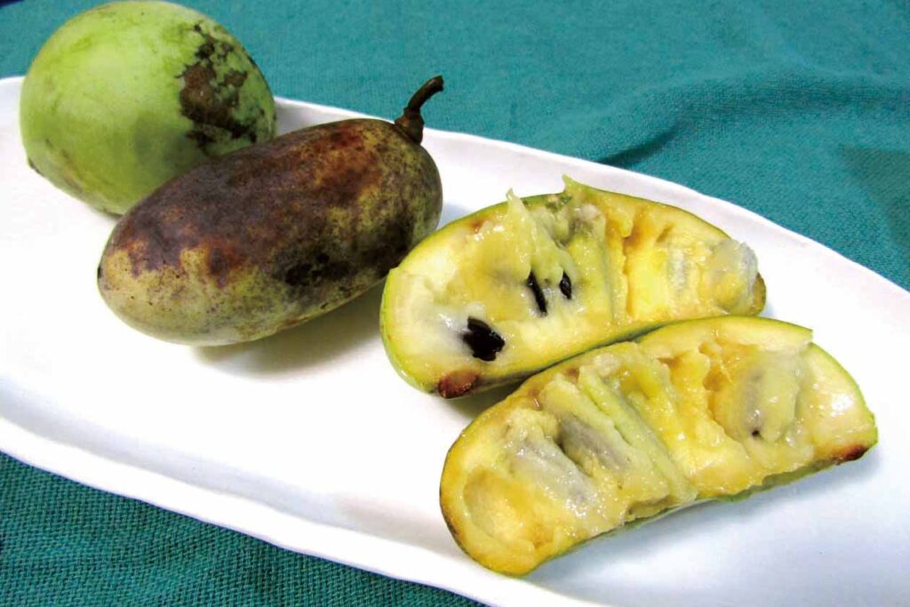 北米原産で、米国ではカスタードアップルとも呼ばれるポポー。熟れてくると芳醇な香りを放つ。緑色の皮が黄色に変わると食べごろ。楕円形の実の中はオレンジ色で、真ん中に黒い種が一列に並ぶ。甘みが強く、とろんと柔らかくカスタードクリームのような味わいだ。