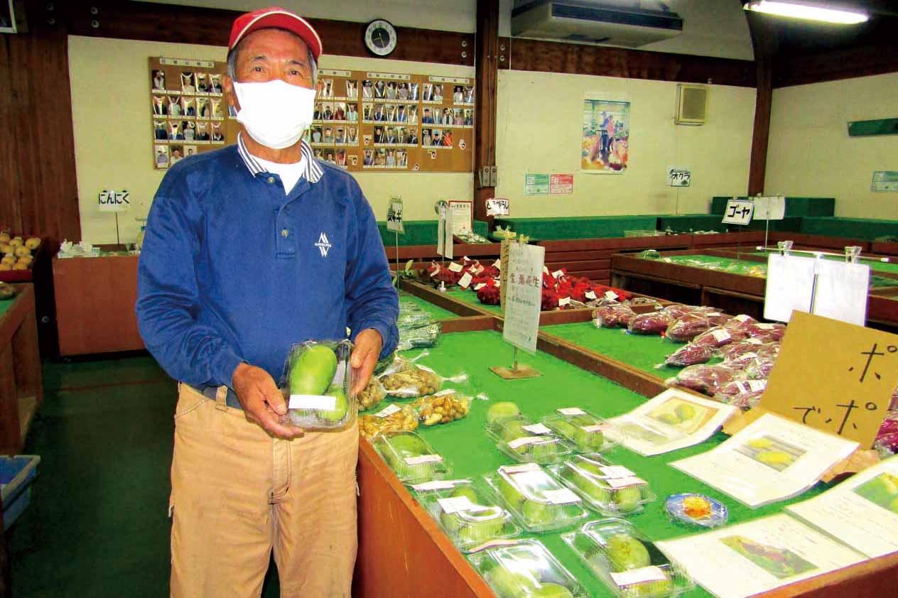 野菜のほかにビワや栗などを栽培する吉岡さんは7年前、ジョイフル本田で苗を見つけ、「珍しいので植えてみよう」と育て始めた。4年前から出荷するようになった。今年は樹の周りに防風対策をしたところ実のつきが良く、初めて450㌘超の実も成った。「熟し始めると早いので、収穫時期を見極めるのが難しい。でも手間がいらず、鳥や虫にも強いので無農薬で育てられます」と話した。(山石)