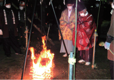 鍋に竹筒を入れて粥を炊く様子を見守る河野宮司ら