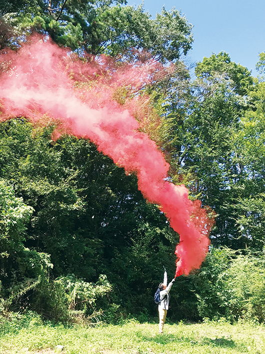 細谷社長は「とにかくこのサイズで煙の量が多いのが特長。遭難時には、いかに見つけてもらうかが生還の鍵となるが、ポッケムは救助する側が見つけやすい鮮やかな赤い煙が出る。山岳地での『赤いお守り』としてぜひ携帯してほしい。防災グッズとしても利用価値があると思う」と新製品を紹介する。