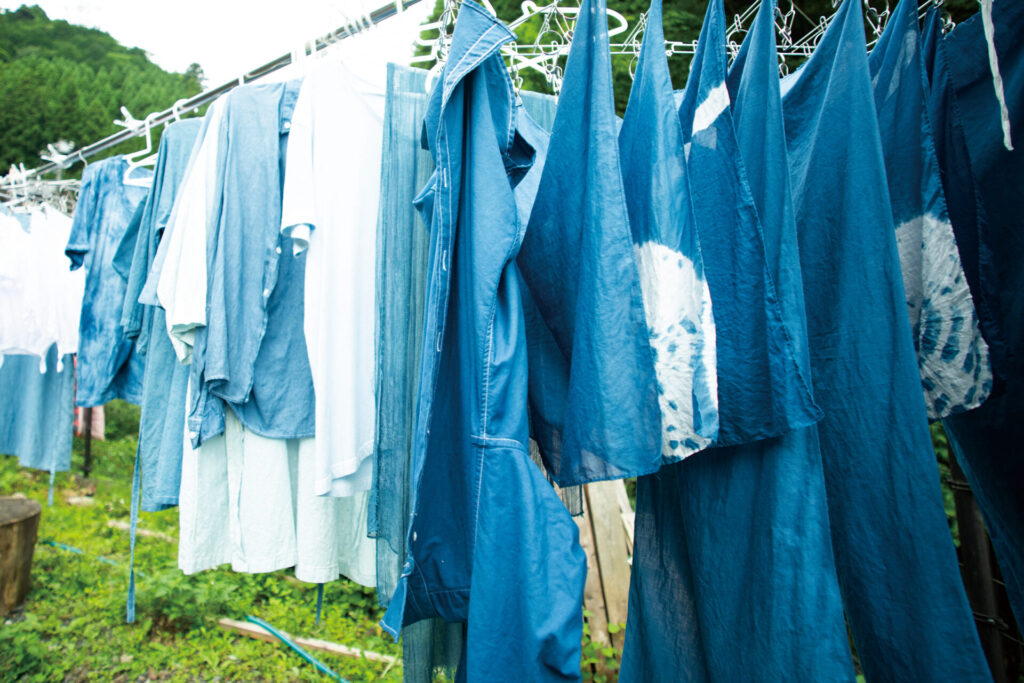 堤さん夫婦が実践する「本建て」は、藍草の葉を堆肥のように発酵させた原料(すくも)を、堅木の木灰からとった灰汁のみで再発酵し、藍液を建てる。通称「地獄建て」と呼ばれるほど難しい技法だ。染めにも手間が掛かる。煮て布の不純物を取り除いたのち、灰汁を布に染み込ませる下処理を施す。布全体に藍液が染み渡るよう指先で何度も揉み込み染める。丁寧に洗い、灰汁をきれいに流し、日光に当てることで、さらに残った灰汁を浮かせる。染めの工程を最低4回は繰り返す。濃い色を出す場合は7〜8回も染めるという。