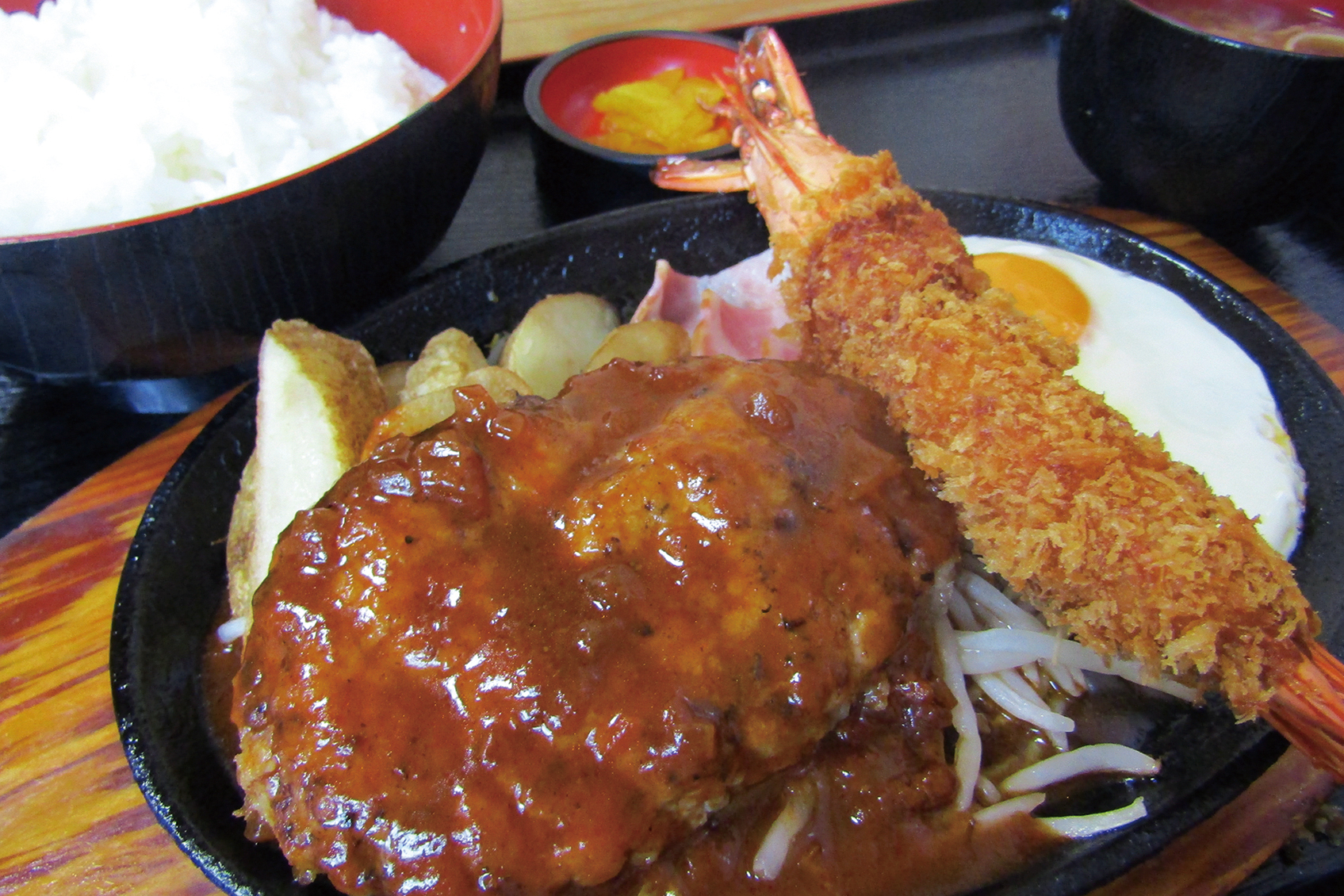 ハンバーグとエビフライと目玉焼きの定食