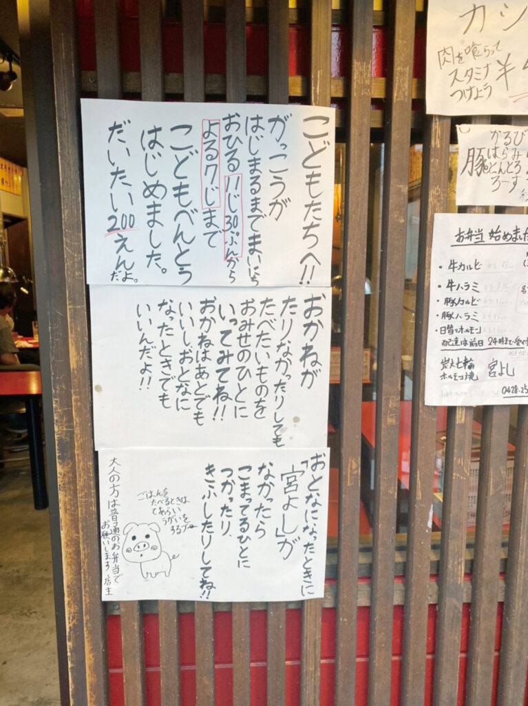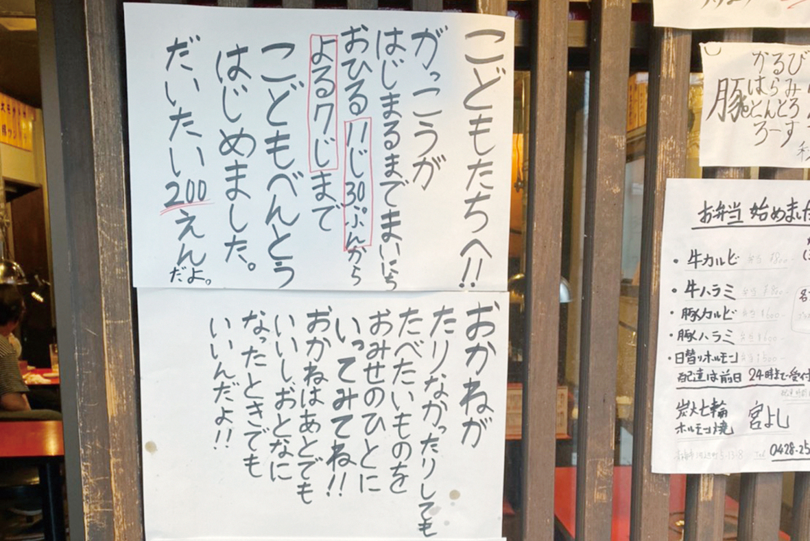 「おかねはあとでもいいし、おとなになったときでもいいんだよ」⸺。河辺駅南口徒歩1分の場所にあるホルモン焼肉店「宮よし河辺店」(伊藤健太店長)の、子ども弁当の貼り紙が8月24日にSNS上で拡散され、話題になっている。現在は貼り紙はしていないが、子ども弁当の提供は続けている。