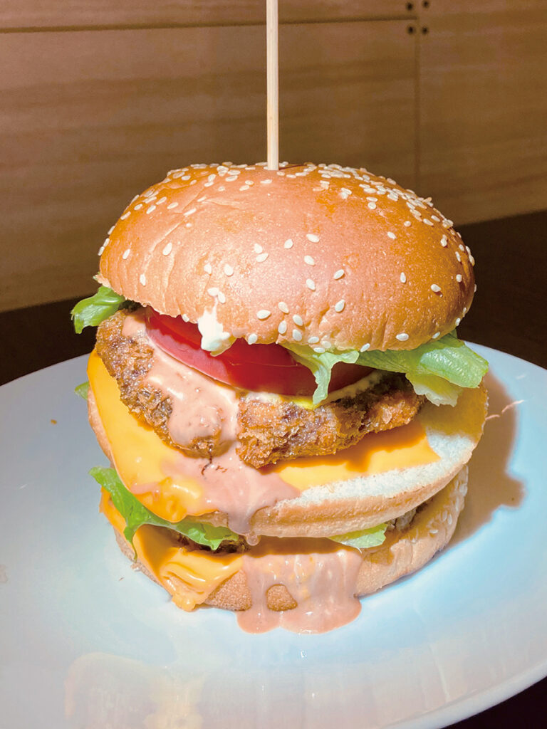 味は照り焼き、チーズ入りなど5種類で、一番人気はチーズ、レタス、トマトが入ったメンチカツ野菜バーガー(1個580円)。若い男性には、厚さ約10㌢のビッグメンチカツ野菜チーズバーガー(980円)も売れている。どれもマスタードの効いた特製ソースが好評だ。