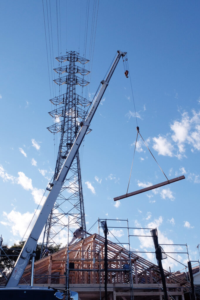 クレーンで部材を吊り上げる。屋根は瓦ぶきにする計画