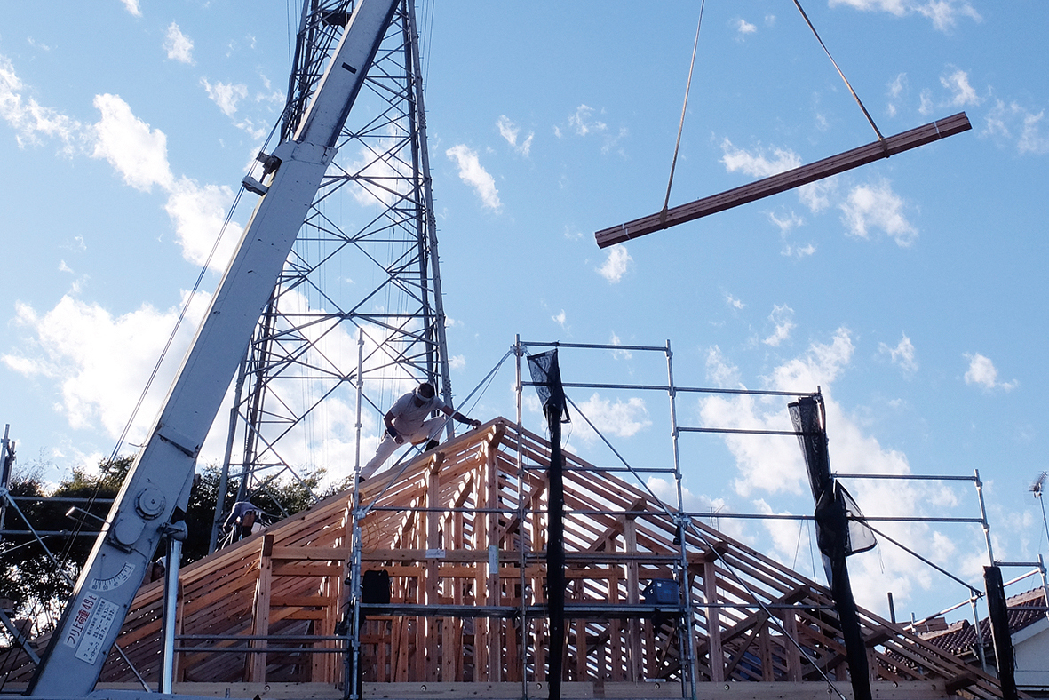 クレーンで部材を吊り上げる。屋根は瓦ぶきにする計画