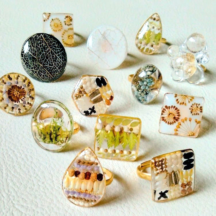 小さなアクセサリーから植物の生命力があふれ出す――。種やガク、花びらなどを樹脂に閉じ込め、ピアスやブローチなど一点もののアクセサリーを作るのがchitoseyaの髙木美穂さん(39)。アジサイ、ホオズキ、ウド…素材の多くは檜原村本宿の自宅周辺で採取したもの。「檜原は素材の宝庫」と目を輝かせる。