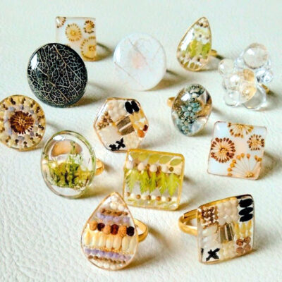 植物の種やつぼみ、繊維などを使ったアクセサリーの数々