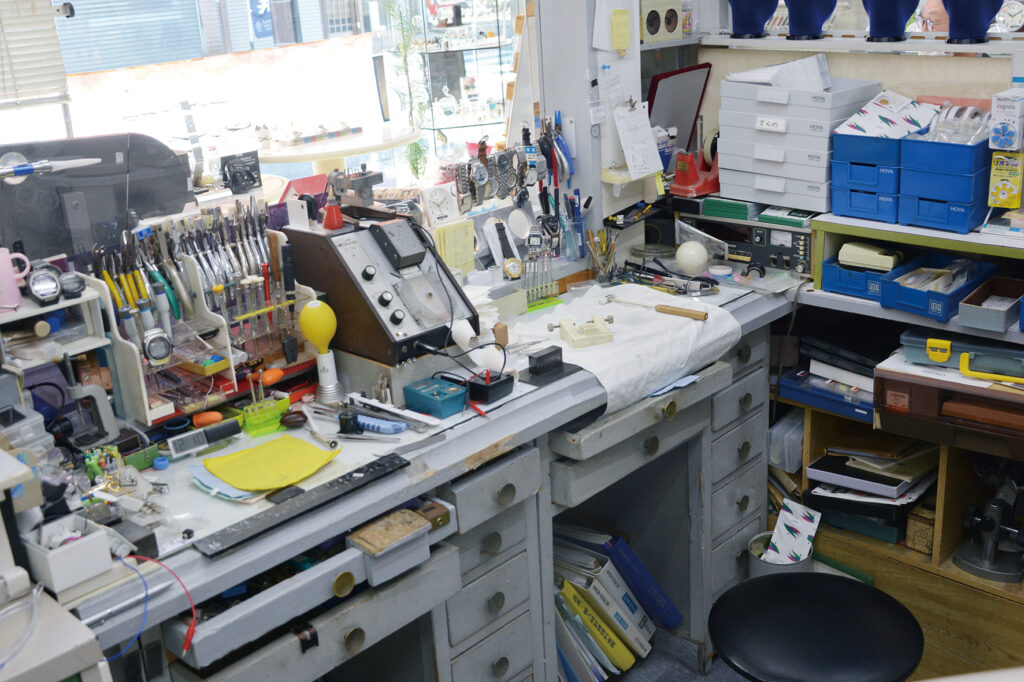 修理は取扱商品全般で受け付ける。腕時計の電池交換(1000円〜)のほか、最近ではオンラインで購入した腕時計のバングを長さ調整で持ち込む人が増えたという。
