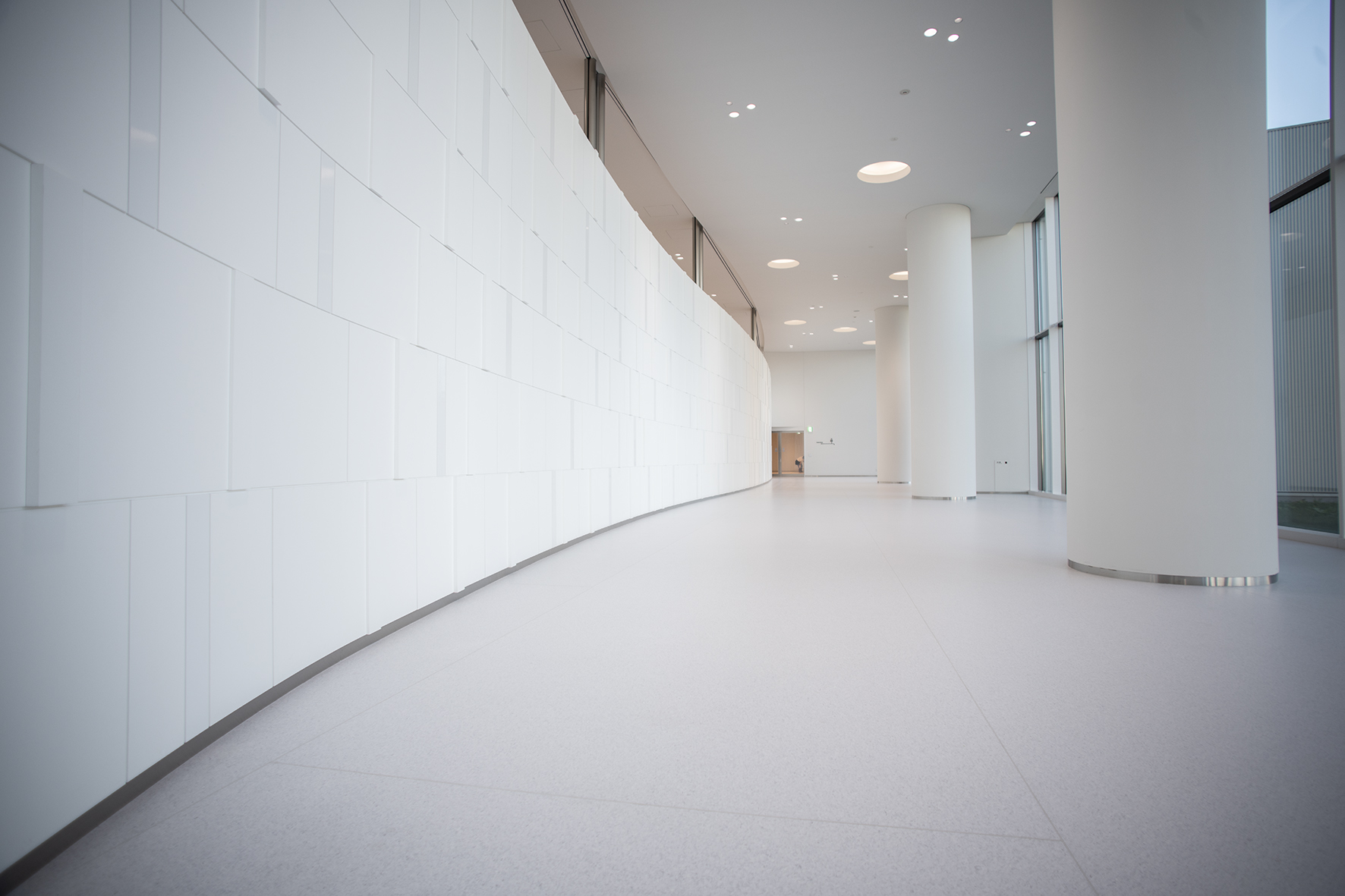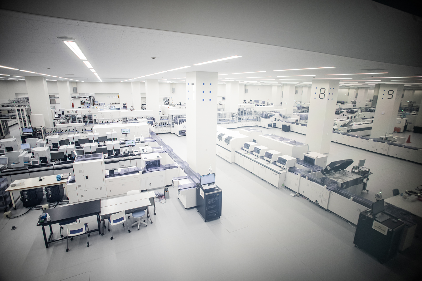 検査ラボ棟のコンセプト「清潔」「正確」を、白を基調とした壁や床で表現するなど、Cubeごとのコンセプトに合わせた内装を採用。また案内表示のピクトグラムもオリジナルのものを使うなど、細部までこだわり抜かれている。