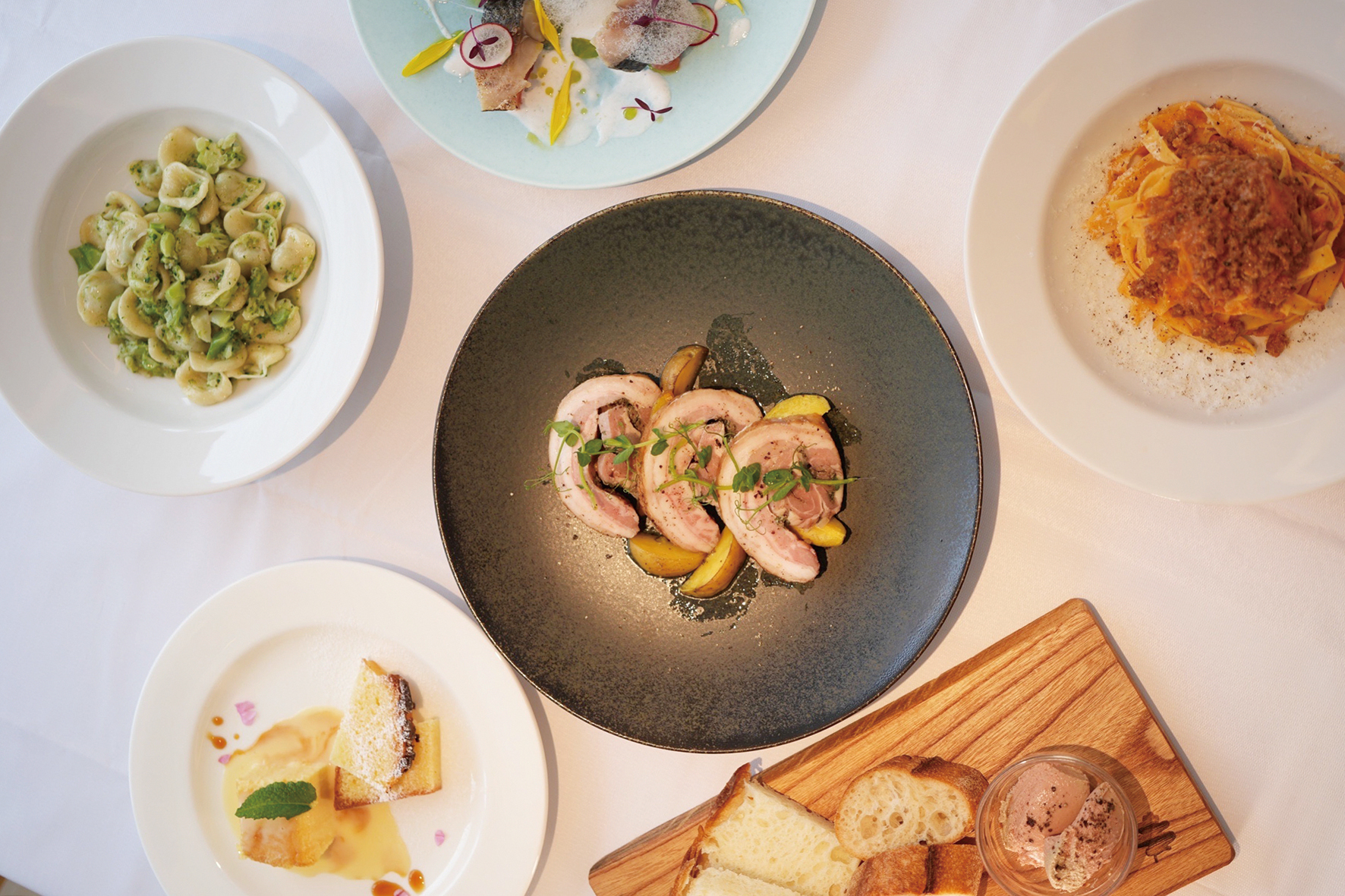 ランチは、サラダ、パスタ、ドリンクがセットのパスタランチ1200円、前菜盛り合わせやデザートが付くコースランチ1680円、シェフの厳選フルコース2980円。ディナーはサラダ、前菜、パスタのほかメインは秋川牛のロースト(2480円)など。