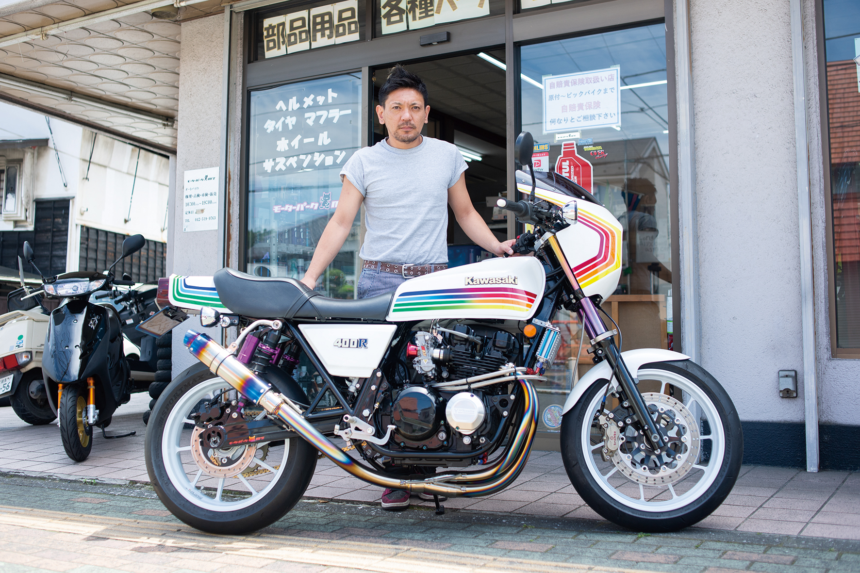 檜原街道沿い、五日市仲町郵便局からほど近い場所にある「モーターパークM2」には、1980年代のカワサキ社製の中型バイクを中心に、店主の関塚由典さん(39)がフルカスタムした車両が並ぶ。タンクカラーやタイヤ、細かな部品まで客の好みに仕上げるカスタムオーダーも受け付けている。
