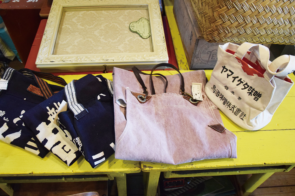 笹本さんは月2、3回、古道具の市場に出向き、素材となる商品を探す。アクセサリーの古いパーツや古布は、妻の幸子さんがエプロンやカバンに仕立てることもある。