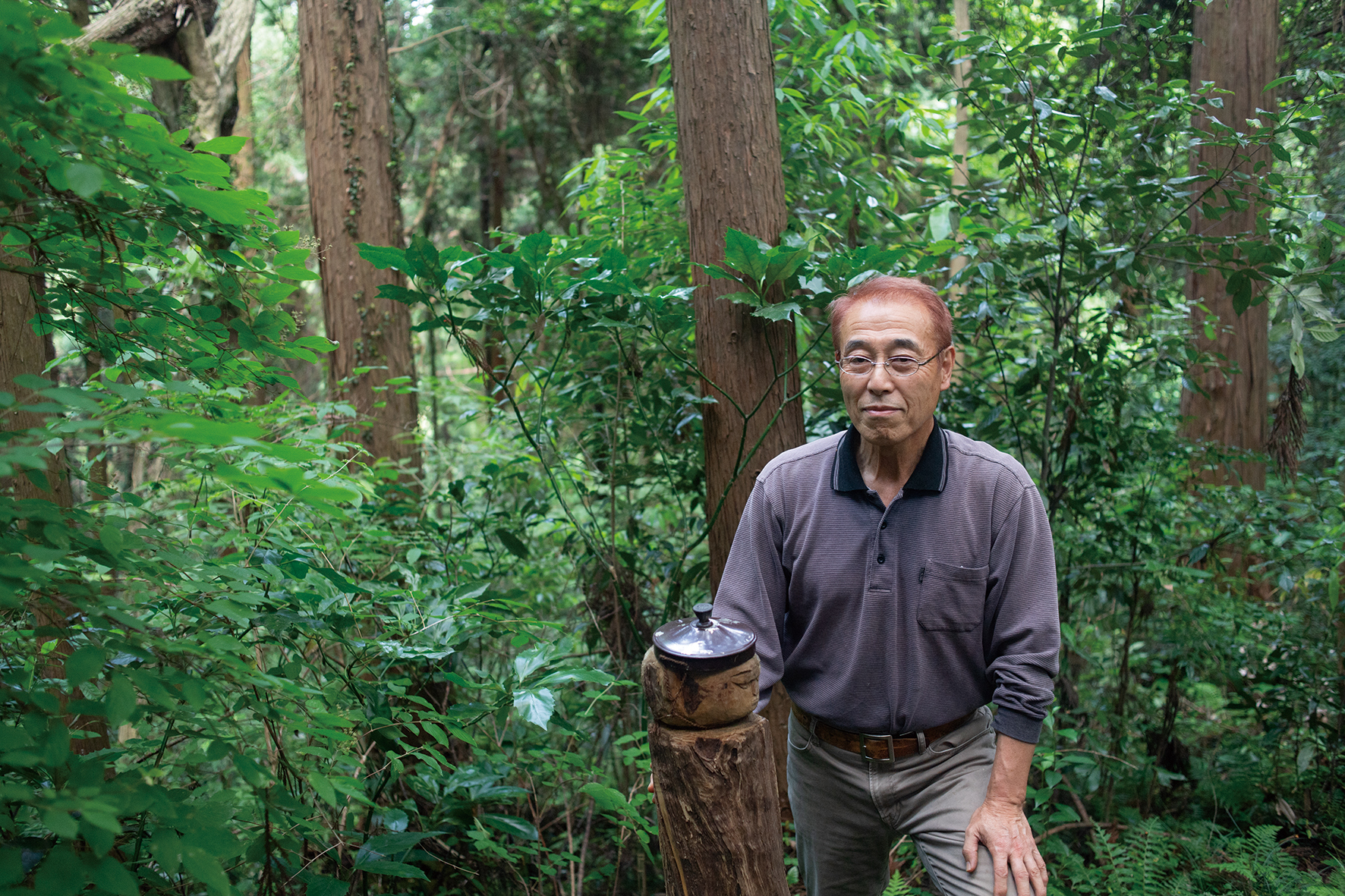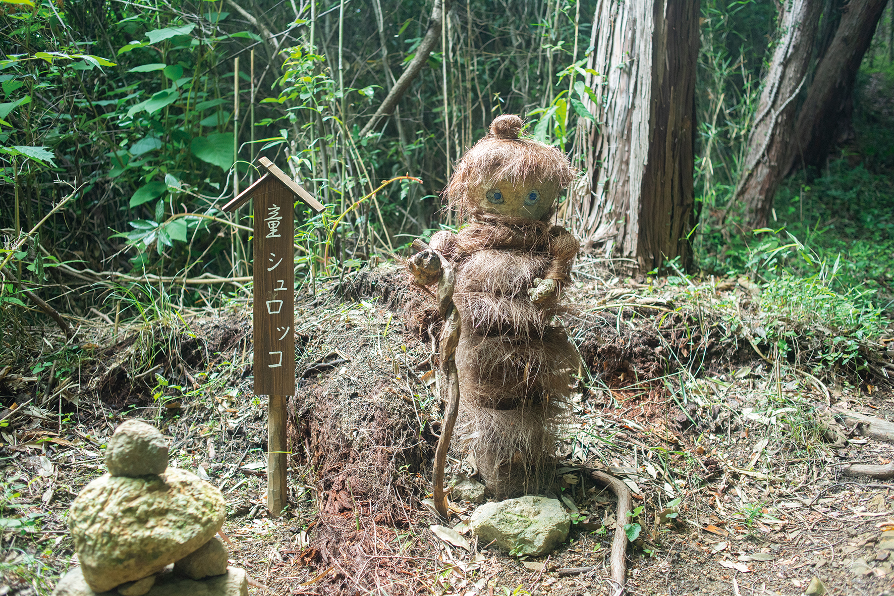 凝り性の橋本さん。整備だけでは飽き足らず、石や枝などで道中にオブジェを作り始めた。枯れたシュロの木と石で作った人形、石を積み上げた灯籠、野鳥のための餌台… 。次は作業中に見つけた石碑前に鳥居を作る計画。