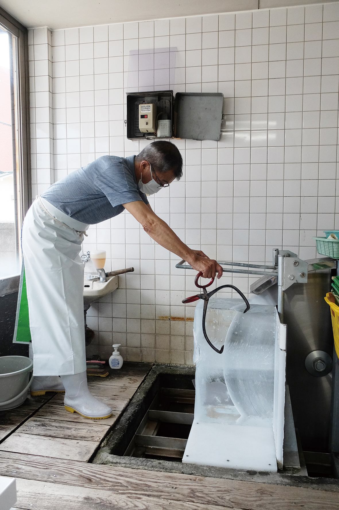 地下水を48時間かけて製氷する1本135㌔の塊を、製氷会社から仕入れる。製氷過程で不純物が取り除かれるため純度が高く、溶けにくい。注文に応じてカットして出荷。小売りは「一貫目」と呼ぶ約3・75㌕のブロック(1袋570円)、ウイスキーなどに使うロックアイス(2㌔450円)で販売。気温の低い朝4時半からカットし始める。