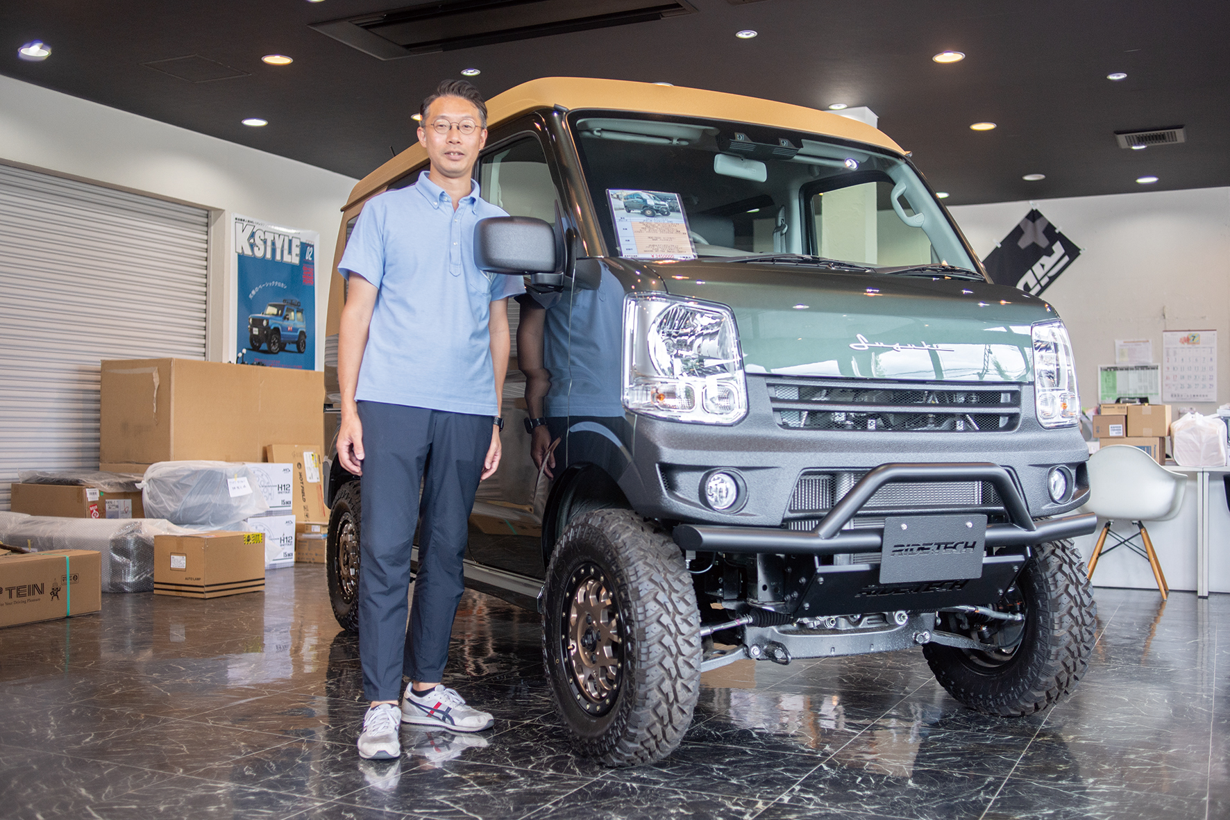 店にはアウトドアスタイル、スポーツスタイルにカスタムしたエブリイ、レトロなデザインに仕上げた四駆車「ジムニー」など多数の車両が並ぶ。カスタムカーを購入できるだけでなく、新車や中古車、所有する車を好みのスタイルに一からカスタムすることもできる。