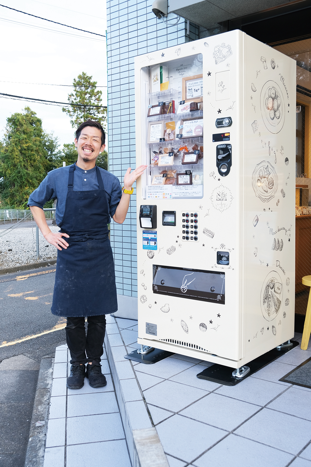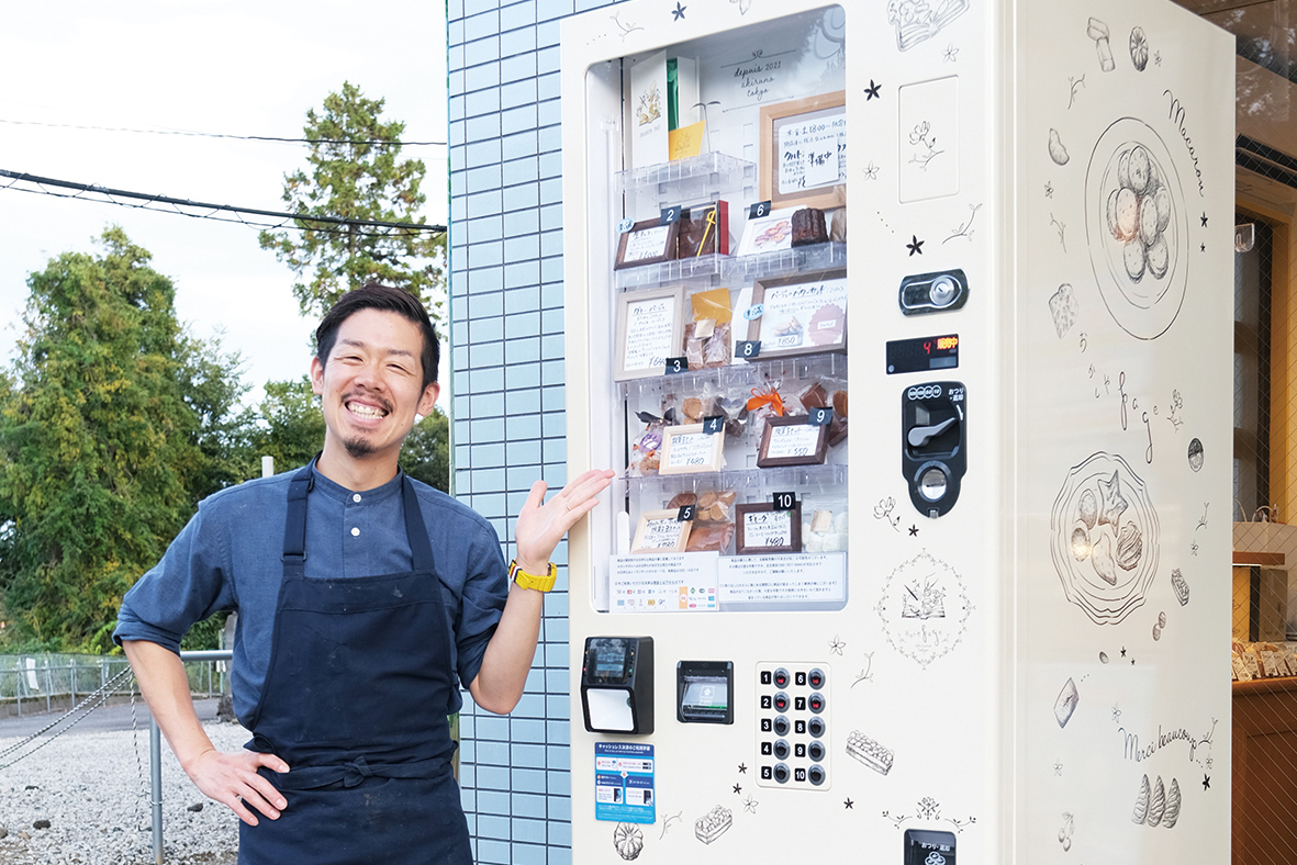 あきる野市五日市の権田坂にある焼き菓子店「おかしやpage(パージュ)」(岡本昌樹店主)は10月20日、店頭に自動販売機を設置した。食品ロスの削減と少ない営業時間を補うための試み。自販機限定の商品も作り、利用を促していく。