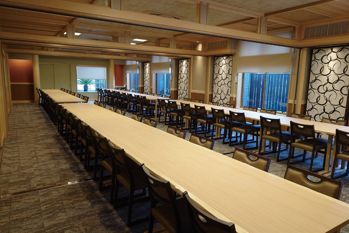 新店舗は平屋建て。広々とした店内はバリアフリーで、車いす用のトイレも設置。ゆったりとしたテーブル席で、最大90人の宴会が可能。