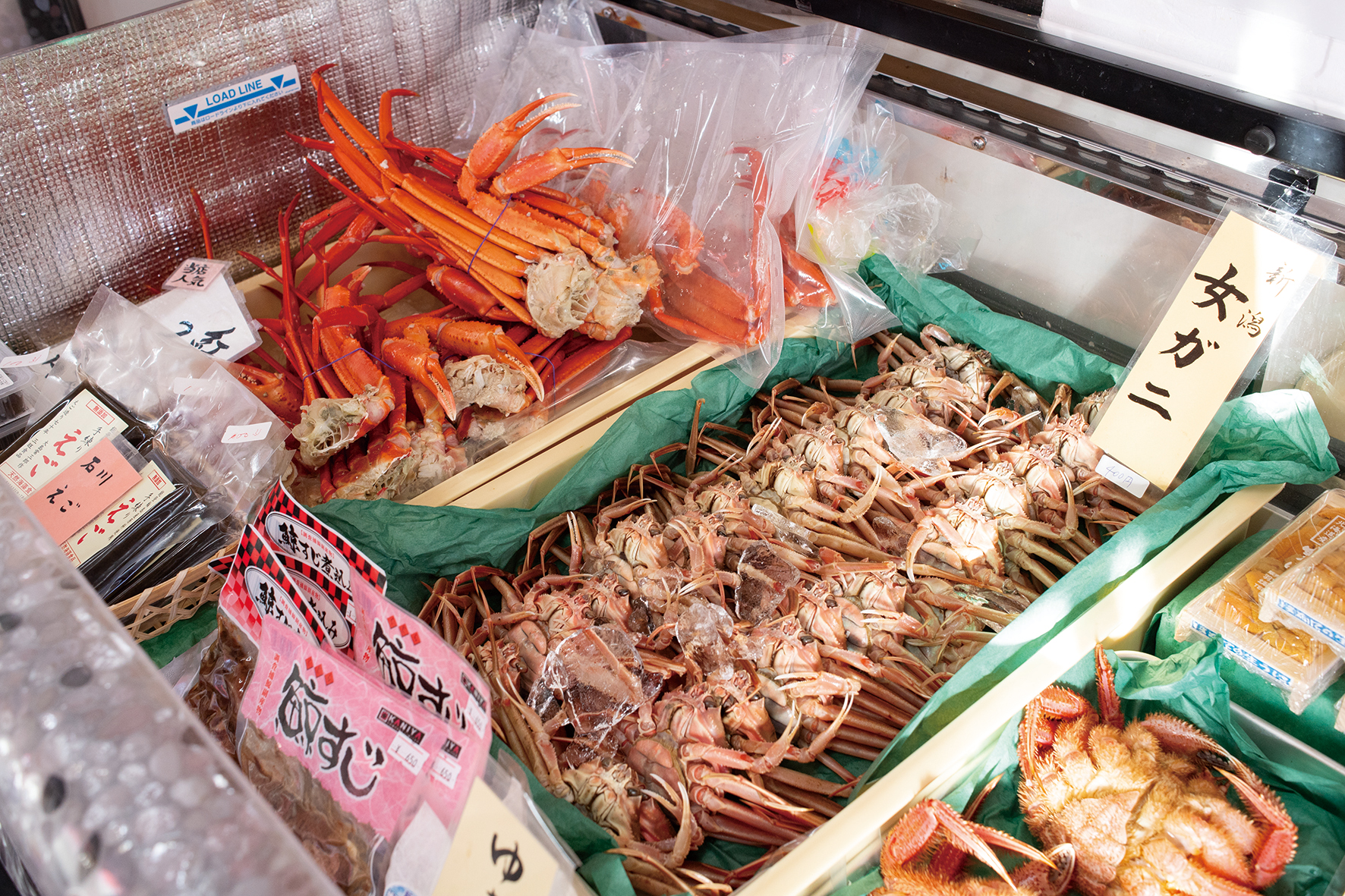 この時期の一番人気は、甘みや味が濃いベニズワイガニ(A3600円、B2800円、脚のみ1800円)。カキ(生食用)やタラ、生ホッケなどもおすすめ。そのほかホタルイカの塩辛やイカの一夜干し、南魚沼産コシヒカリなども並ぶ。