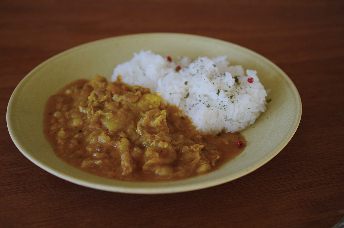 カフェでは、自家製のスパイスカレーや生ハムなどの前菜盛り合わせ、コーヒーや焼き菓子が楽しめる。「食に関するものや好きな作家を紹介したい」との思いから、店で使用する器やワイングラスも販売する。