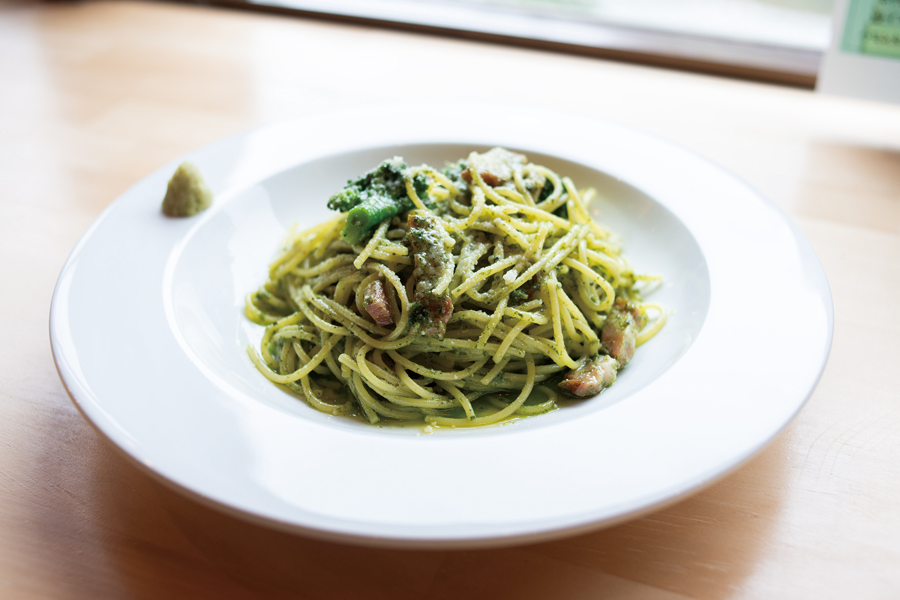 パスタは3種。柘植料理長おすすめは「ベーコンブロッコリージェノベーゼ」(1280円)。添えられた生ワサビのすりおろしが良いアクセント。ほかにトマトと塩、オリーブオイルのみで味付けした「シンプルトマトソースパスタ」(980円)、平麺の生パスタのもっちり感が特徴の「ツナほうれん草パスタ」(1380円)がある。